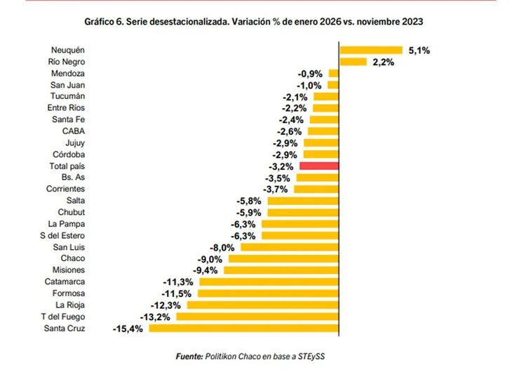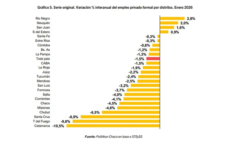 En tanto, al comparar el empleo de manera interanual, cuatro provincias mostraron mejorías en enero: Río Negro (+2,8%), Neuquén (+2,6), San Juan (+1,6%) y Santiago del Estero (+0,9%).